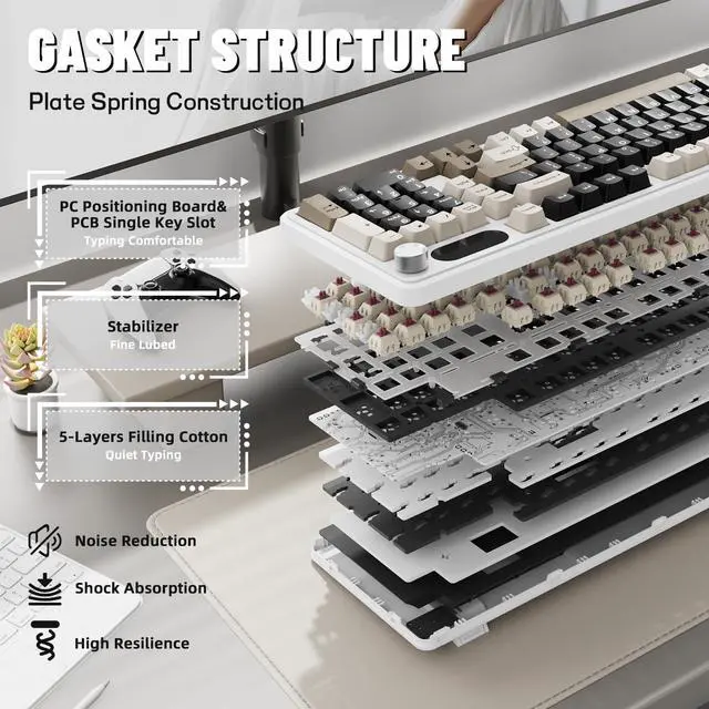 Premium Gasket MountSuperior Sound & Feel Enjoy the perfect balance of softness and stability with our innovative 20-point cross-beam gasket mount. Combined with 5 layers of sound-dampening materialsincluding IXPE switch pads, PORON foam, and silicone dampenersit delivers a satisfying, quiet keystroke with a deep, thocky sound. Say goodbye to hollow noises and experience pure, high-fidelity acoustics with every press.