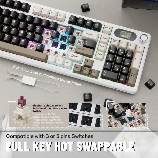 Tri-Mode Connectivity & Hot-Swappable Switches Seamlessly switch between Bluetooth 5.0, 2.4G wireless, and USB-C wired modes for the ultimate flexibility. Whether you' re gaming on Windows, designing on Mac, or coding on Linux, connect without limits. The hot-swappable PCB lets you easily swap between 3-pin and 5-pin mechanical switchescustomize your typing feel without soldering!
