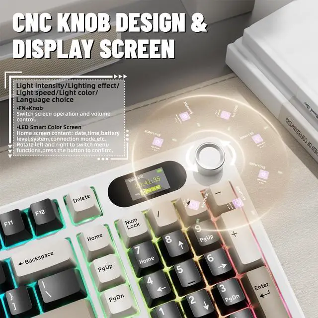 CNC Metal KnobIntuitive & Multi-Functional Take control with a twist! The premium CNC anodized aluminum knob isnt just for looksit lets you adjust volume, brightness, RGB effects, connection modes, and more with precision. Whether you' re gaming, working, or just vibing, the smooth tactile feedback ensures effortless control over your setup.