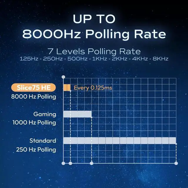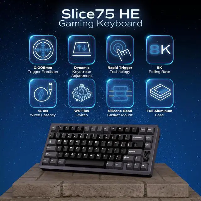8000Hz Polling Rate: The Slice75 rapid trigger keyboard boasts an 8000Hz polling rate and 32K scanning rate that effectively reduces keyboard latency to a mere 0.125 ms. Say goodbye to input lag and take control of speed, your esports performance will be fast responsiveness. For gamers, performance is always more important than anything else