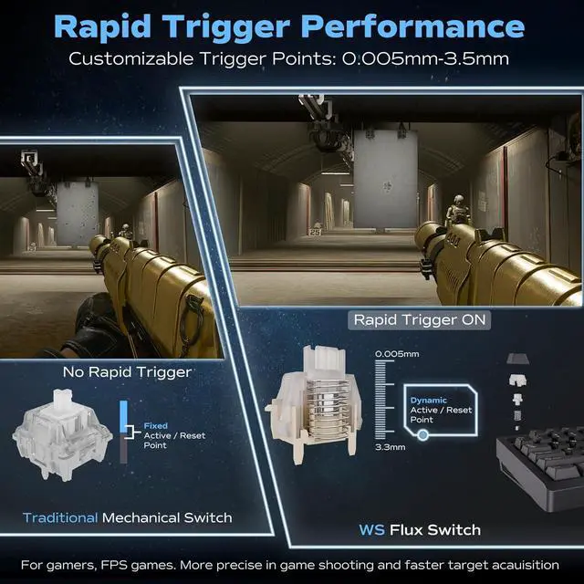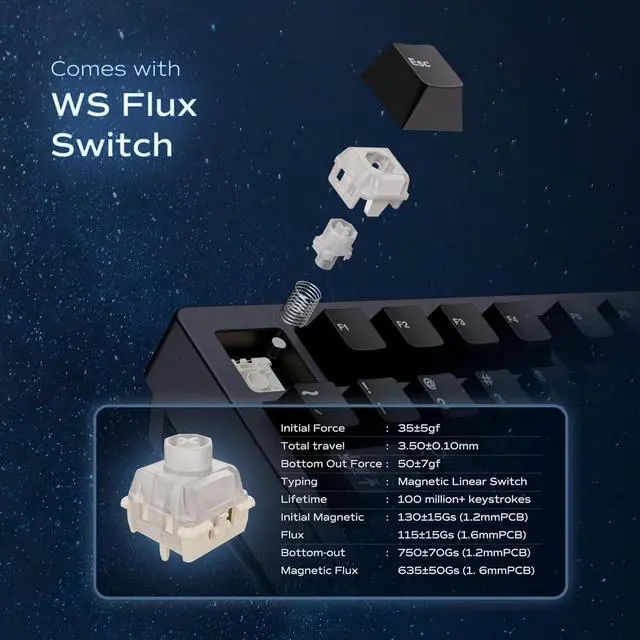 Hall Effect Magnetic Switches: Utilizing WS Flux HE Clacky Switch features 0.005 mm actuation adjustment and Hall effect sensors with a contactless trigger, ensuring adjustable actuation ( 0.005 - 3.5 mm). The switch offer a clean, clacky top-out with excellent responsiveness. That, paired with dynamic keystroke settings like rapid trigger and snappy tap, makes this keyboard perfect for competitive FPS gamers