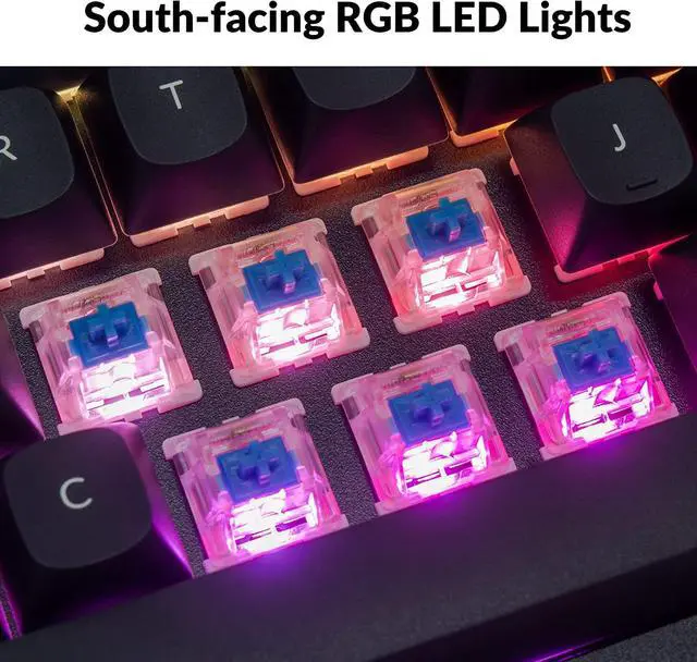 South-Facing RGB & PBT Keycaps: Featuring south-facing RGB LEDs for even backlighting and durable double-shot PBT keycaps that resist shine and wear. The large stabilizer keys have been optimized to prevent rattling and ensure stability,, while remaining compatible with third-party stabilizers for customization.