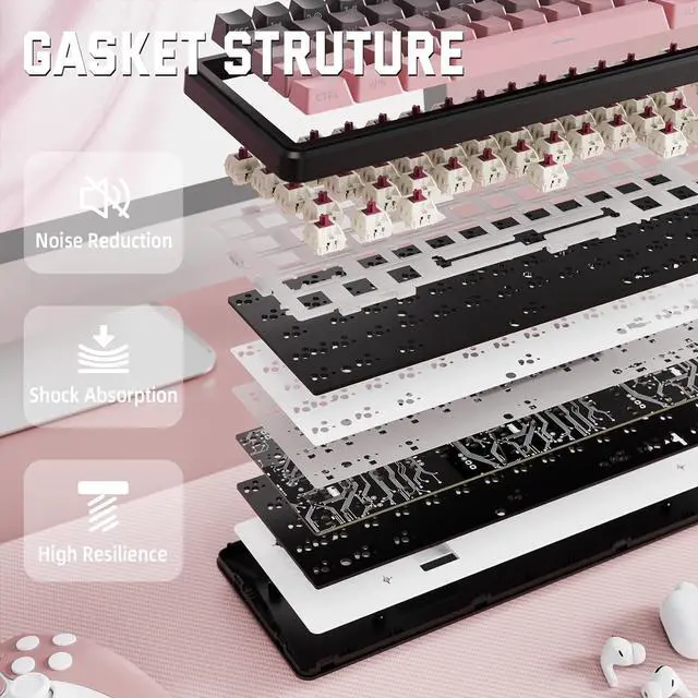Hot Swappable & Pre-lubed Strawberry SwitchesFull Hot swappable mechanical keyboard comes with pre-lubed Strawberry switch, creamy sound and excellent smooth keystroke. Unique customized switching equiped 1.2 mm double-layer black oil single-key slotted PCB board, improve key stability and input experience, accurately position, prevent the key bounce and mistouch, greatly response speed of the keyboard. High quality PCB board compatible with 3pin/5pin switches, you can making your own unique keyboard.