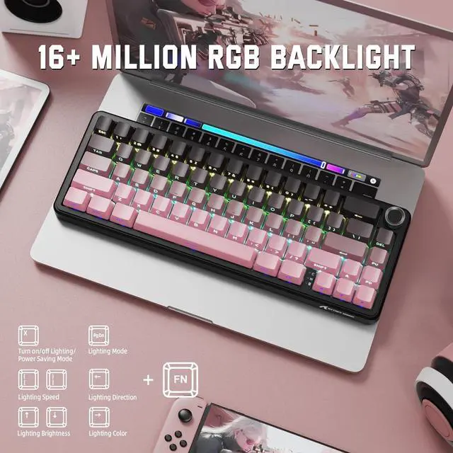 High quality accessories & Wide CompatibleX66 pink gaming keyboard features popular side-printed gradient PBT keycaps that are not easy to oil, non-slip and wear-resistant. The package comes with a 2-in-1 steel key puller and shaft puller, two strawberry switches and a 1.5 meter TYPE-C cable, giving customers a convenient and durable tool and room for error for DIY keyboards. PC gaming Keyboard compatible with Windows/MacOS system to meet diverse life gaming needs.