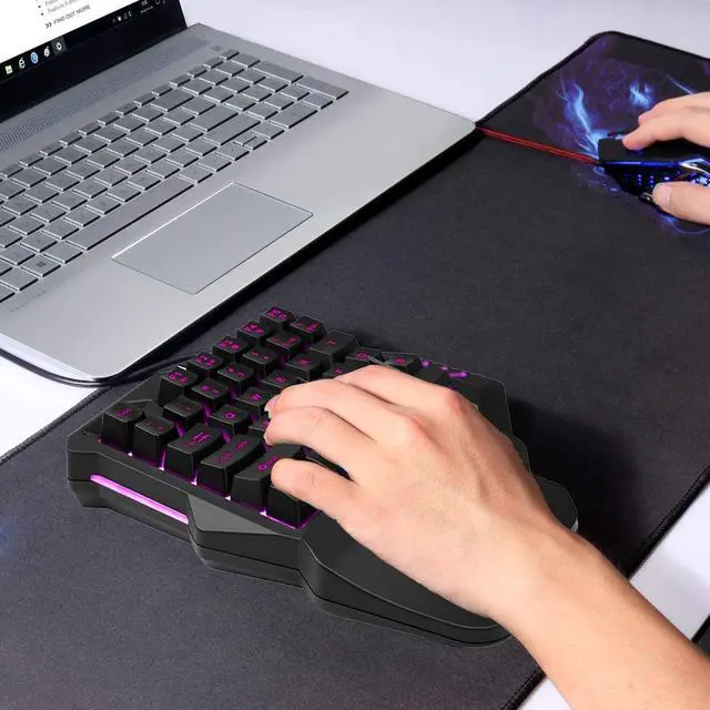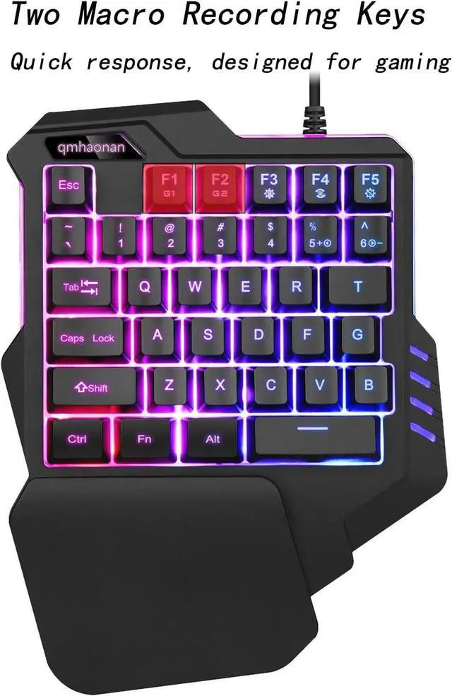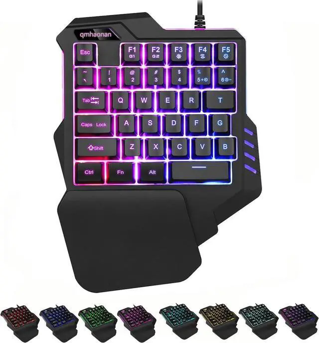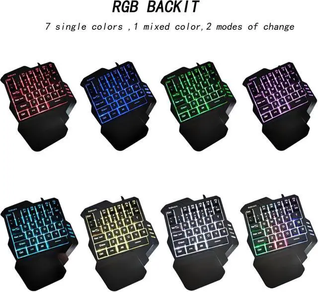 COLORS LED BACKLIGHT: The gaming one handed keyboard has 7 colors to choose: red, blue, green, purple, cyan, yellow and white, also a mixed color, totally 8 choices.