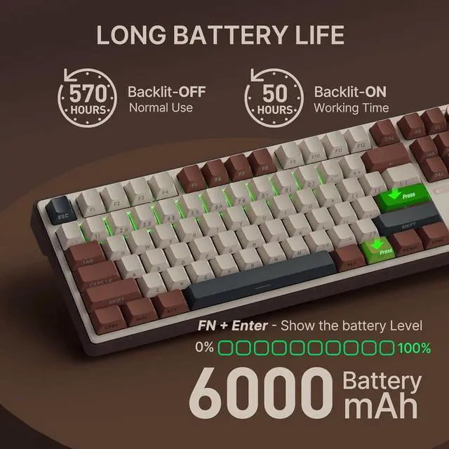 Tri-Mode Wireless Keyboard with 6000mAh Battery Enjoy seamless connectivity with a wireless mechanical keyboard that supports Bluetooth, 2.4GH z wireless, and USB-C wired options. Powered by a 6000mAh battery, this gaming keyboard delivers up to 570 hours of continuous use with RGB lights off, perfect for long gaming or work sessions