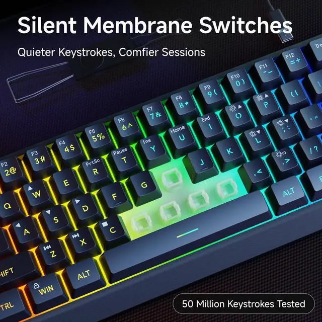 Ergonomic design and mechanical feel: This 60% mini keyboard features an ergonomic design that fits perfectly to your fingertips, ensuring comfortable extended use. Advanced mechanical-like technology provides a satisfying typing feel while maintaining the quietness of a membrane keyboard. Its compact size and powerful feel make gaming easier