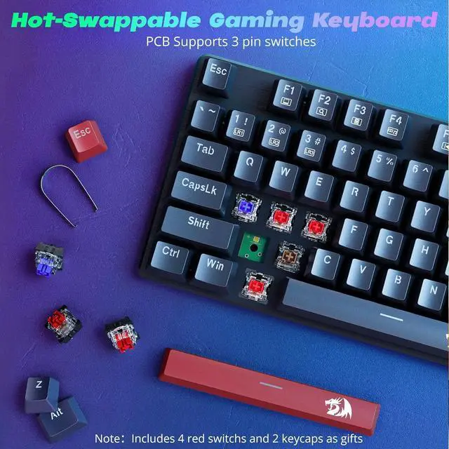 Hot-swappable Linear Red Switch- Our K671 gaming keyboard features red switch, which requires less force to press down and the keys feel smoother and easier to use. It's best for rpgs and mmo, imo games. You will get 4 spare switches and two red keycaps to exchange the key switch when it does not work.