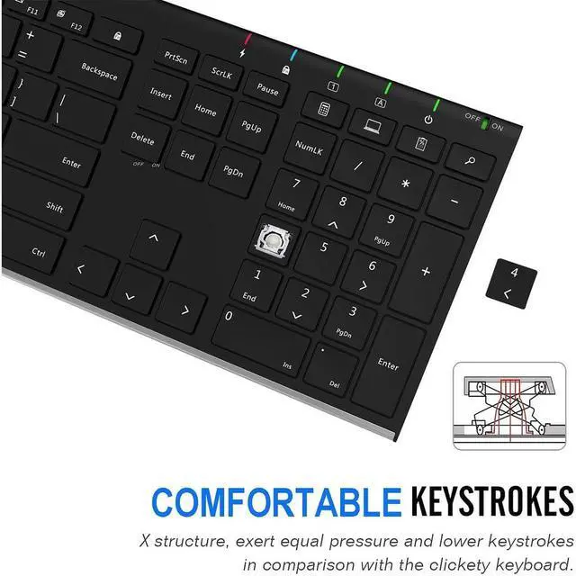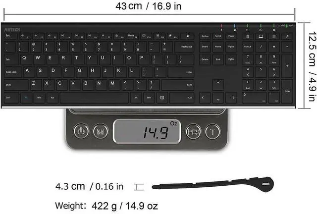 Ultra Thin and Light: Compact size (16.9 X 4.9 X 0.6in) and light weight (14.9oz) but provides full size keys, arrow keys, number pad, shortcuts for comfortable typing.
