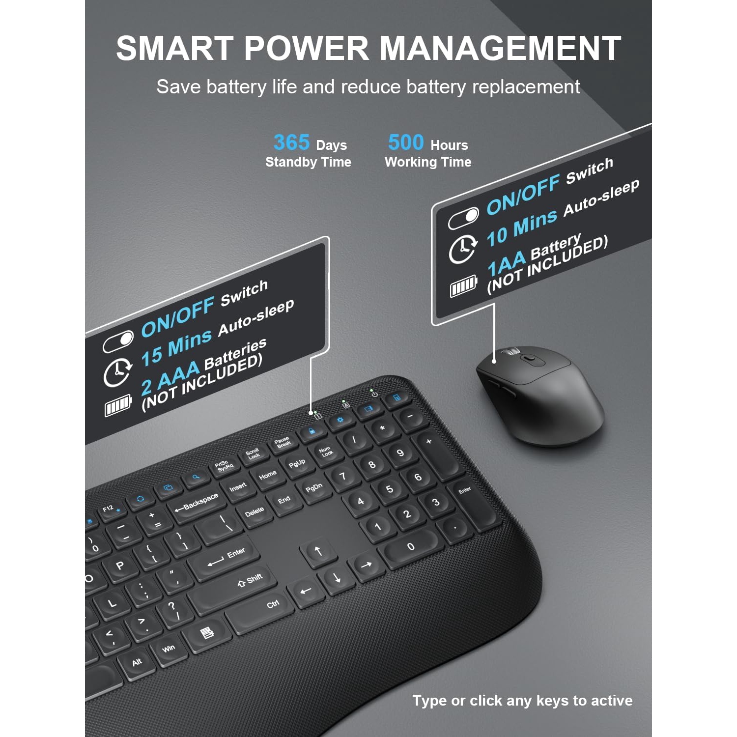 AUTOMATIC POWER SAVING FUNCTIONThe wireless keyboard and mouse combo has the function of automatically entering the power-saving state. When you stop using the keyboard more than 15 minutes, stop using the mouse more than 10 mins, they will enter sleep mode respectively to save power. This feature greatly extends the battery life, you can click any button to activity the device. The keyboard needs 2 x AAA battery, the mouse needs 1 x AA battery. (Battery Not Included)