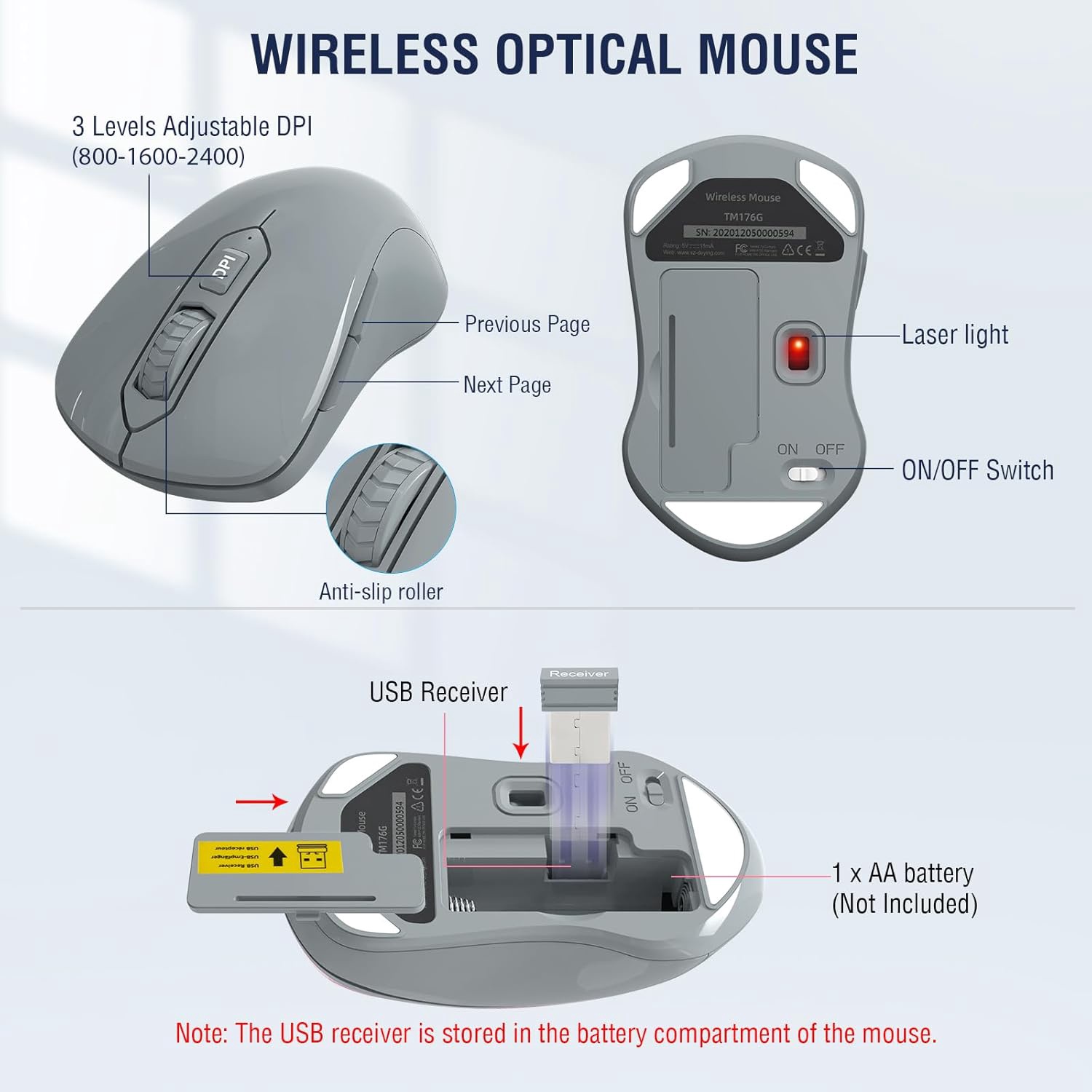 Wireless Optical MouseThe mouse was optical design, even on some smooth surfaces, precise control can be obtained. 3-level adjustable DPI (800/1600/2400) allows you to choose your favorite moving speed of cursor. In addition, this wireless mouse is symmetry design, no matter you are Right handed Left handed, both hands are available, suitable for all people.