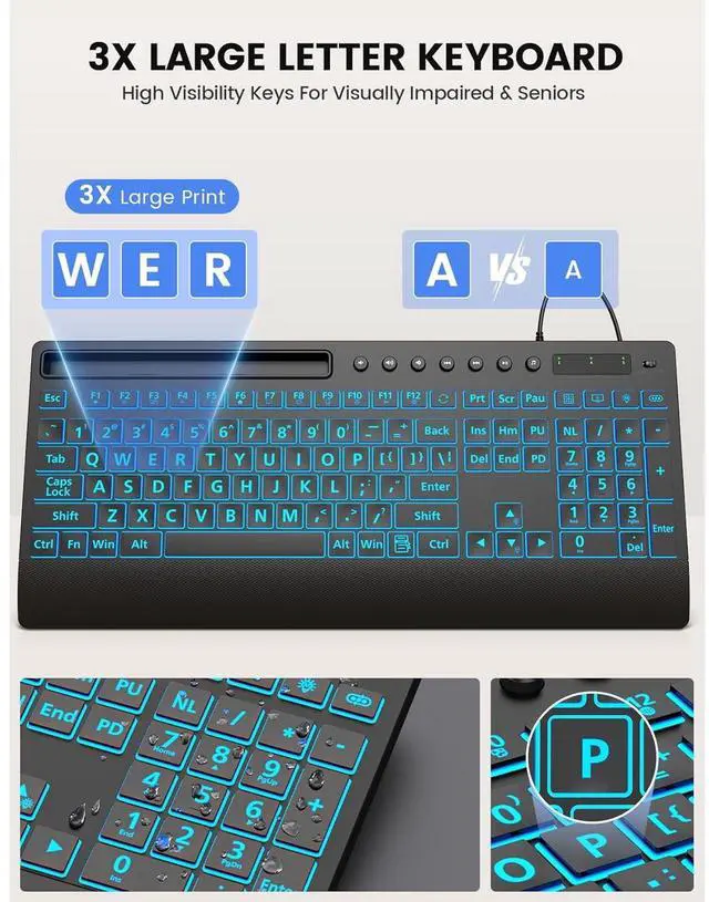Eyesoul Large Print Backlit Keyboard, USB Wired Computer Keyboard with Backlight Memory Function, Wrist Palm, 7-Color Lighted Office Home Keyboards,Light Up Keyboard for Windows Desktop, Laptop, PC