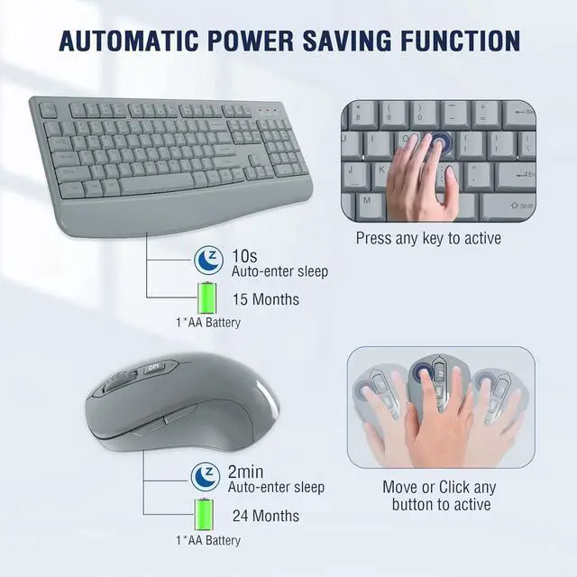 [Auto-enter Power Saving Function] : This wireless keyboard mouse combo need not any switch, It has a smart power saving chip, when you stop using the keyboard more than 10 seconds, stop using the mouse more than 2 minutes, they will auto-enter sleep mode respectively to save power. This feature greatly extends the battery life, you can click any button to activity the device.