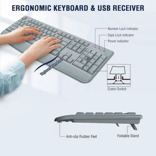 [Comfortable Wireless Keyboard Mouse Combo] : This wireless keyboard mouse combo has a comfortable touch and typing feel, this wireless keyboard design with palm rest and folding holder that can protect your wrists from injury even when typing for a long time. Note: The USB receiver is in the battery compartment of the keyboard, you can find it when open the keyboard battery cover.