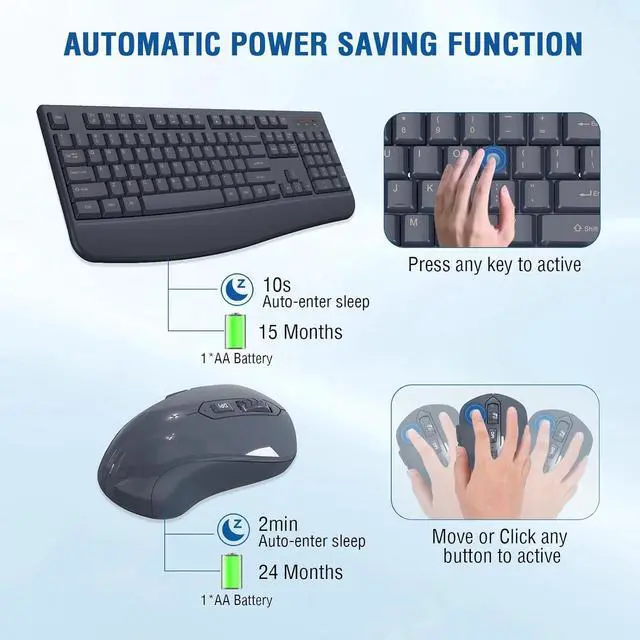 [Auto-enter Power Saving Function] : This wireless keyboard mouse combo need not any switch, It has a smart power saving chip, when you stop using the keyboard more than 10 seconds, stop using the mouse more than 2 minutes, they will auto-enter sleep mode respectively to save power. This feature greatly extends the battery life, you can click any button to activity the device.