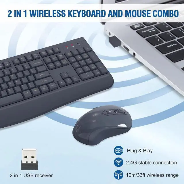 [2. 4G Stable Wireless Connection] : This wireless keyboard and mouse combo share the same USB receiver, no need to take upadditional USB ports (Also the wireless keyboard and mouse can also be used separately). Plug & play, no need to download any software, 2.4 GHz wireless provides a powerful and reliable connection up to 33 feet(10m) without any delays.