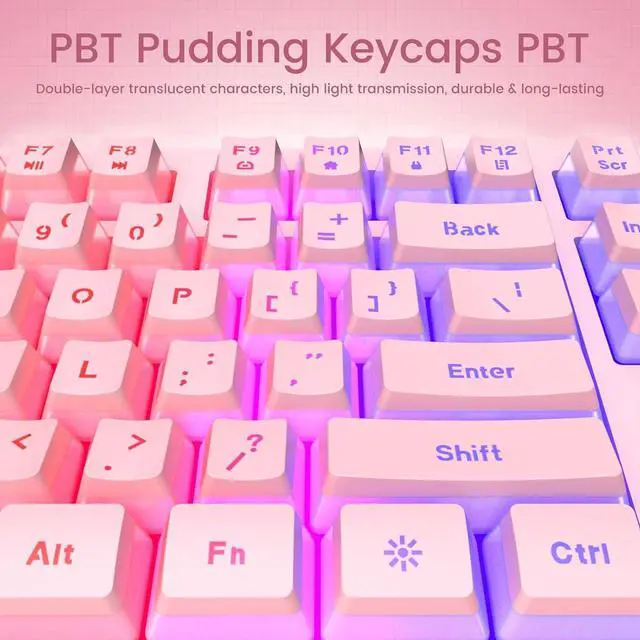 PBT Transparent Keycaps The standout feature of this cute creamy keyboard is the incorporation of PBT transparent keycaps, which not only enhances its aesthetics but also provides a uniquely gentle and distinctive translucency compared to standard ABS keycaps. The PBT material adds a tactile quality to each keypress, delivering a superior typing experience that withstands extended periods of use.