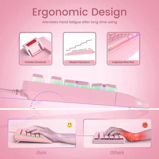 Ergonomic Wrist RestIntegrated ergonomic hand rest, the appropriate height enables the wrist to be comfortably placed on the wired keyboard and supports the wrist effortlessly. The scientific stepped keycap design allows easy finger access to all keys, maximizing hand comfort for long hours of gaming or work.