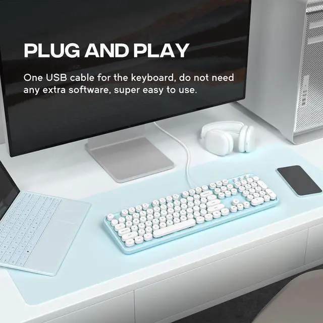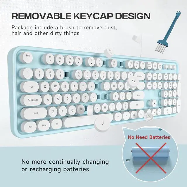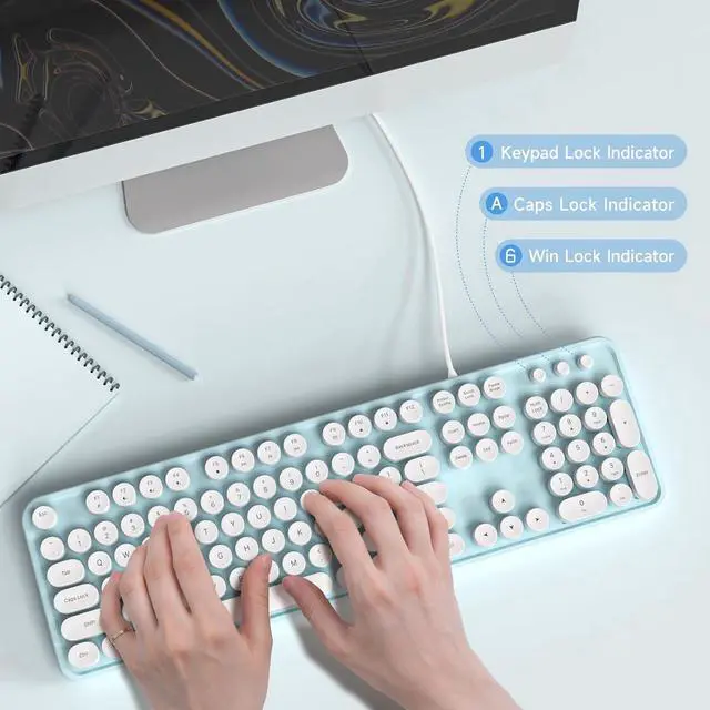 Eyesoul Computer Keyboard Wired, Plug and Play USB Retro Round Typewriter Keyboard, Full Size Wired Keyboard with Foldable Stands for Laptop and Office PC- Blue&White Colorful