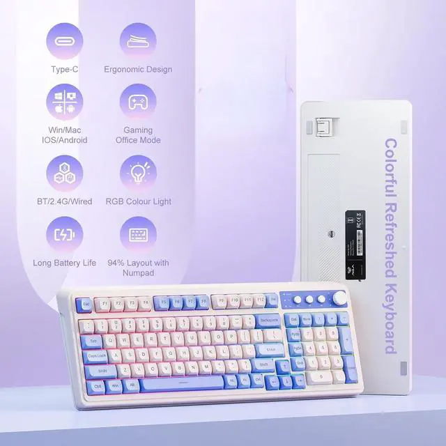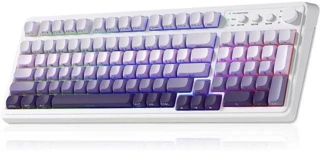 Full Key Programmable: This custom keyboard supports full-key macro programming to create exclusive shortcut operations, helping you trigger complex commands with a single click and be a step ahead in the game. The unique dual-mode knob design of the purple keyboard wireless allows you to quickly switch between gaming and office modes. In addition, with 3 programmable shortcut keys (M1/M2/M3), the usb keyboard lets you easily set up personalized functions to improve operational efficiency