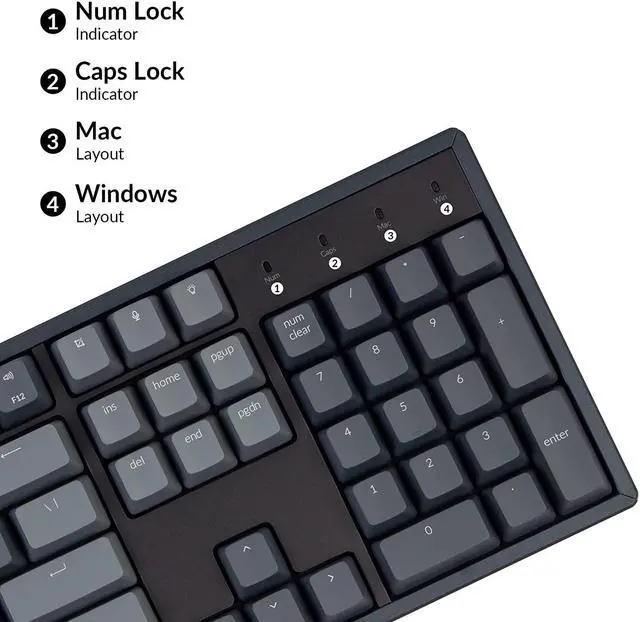With a unique Mac layout while compatible with Windows, the K10 has all essential multimedia and function keys you need (Num Lock works with Windows only), and comes with a dedicated Screenshot Key, Siri (Cortana) Key, and Screen Lock Key. Extra keycaps for both Mac and Windows operating systems are included.