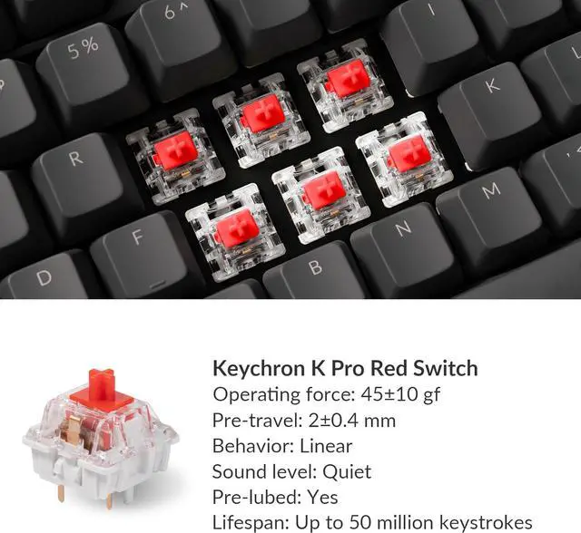 With the Keychron K Pro mechanical switch providing unrivaled linear responsiveness on the Red switch with up to 50 million durable keystroke lifespan. N-key rollover (NKRO) on wired mode or 6KRO on wireless mode.