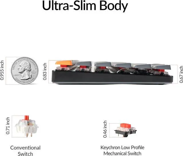 The redesigned low-profile Keychron mechanical switch is 40% slimmer than conventional switches with a shorter pre-travel and total travel distance that triggers an input and feedback faster than conventional/normal-profile mechanical switches.