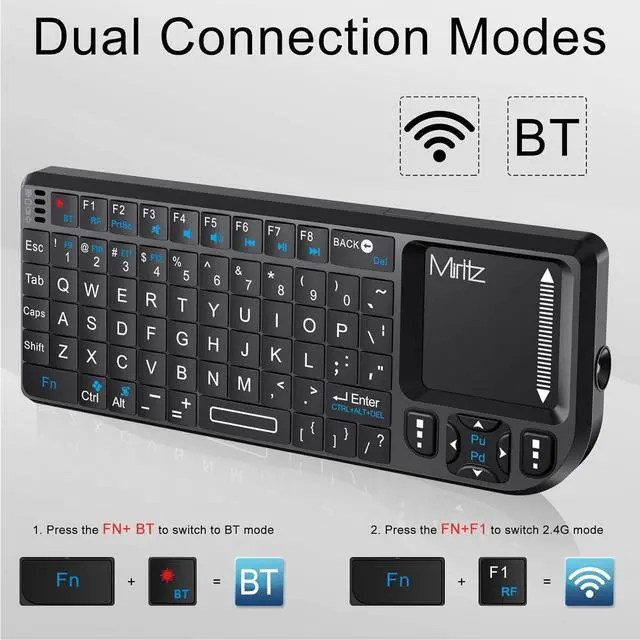 Dual-Mode DesignThis mini wireless keyboard Simultaneously supports both Bluetooth and 2.4G connections, offers a stable transmission range of up to 33 feet.