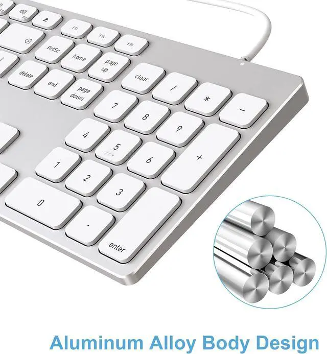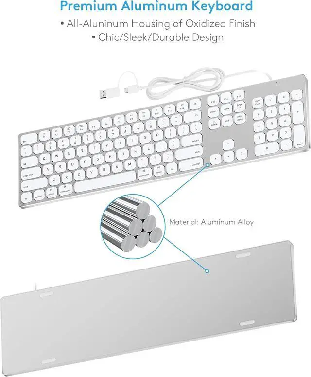 Aluminum Alloy Housing. 17 Keyboard with low profile keys. Full Size Keyboard with Numeric Keypad. 12 Apple shortcuts. Compatible to Apple Mac OS. One Year Warranty.