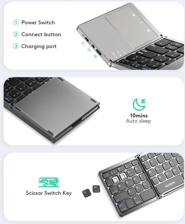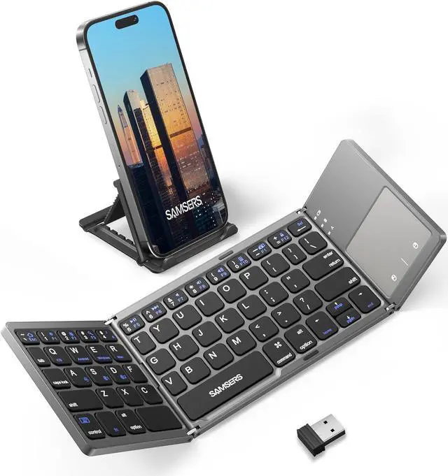 Dual-Mode Foldable Wireless KeyboardSamsers multi-device Bluetooth keyboard supports 3 devices connection simultaneously, seamless switching without delay ( 2.4G wireless + Bluetooth 1 + Bluetooth 2). The attached 2.4G receiver allows laptops or desktops without Bluetooth function to connect and use worry-free! You can type, switch, and continue typing!