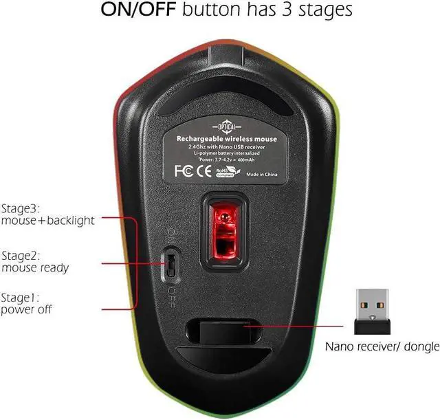 Attention please: before Nano USB paired in your PC, the backlight will be on temporarily; After inserted in and paired with mouse, the backlight will be everlasting. On or off of backlight is up to your needs by switch at the bottom which has 3 stages.