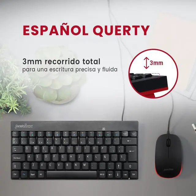 Mini set con cable: Periduo-212 española un set de teclado compacto y ratón, viene con 80 teclas (291x138x20 mm), incluye un ratón óptico standard de 1000 DPI (104x62x34mm). El teclado de configuración en español, permite tipear con facilidad las tildes y otros caracteres de la lengua española