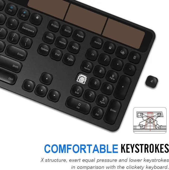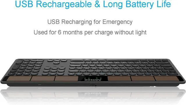 Solar-Powered Keyboard: No battery hassle or cable charging hassle. Any light source keeps your keyboard recharging while working or not working.