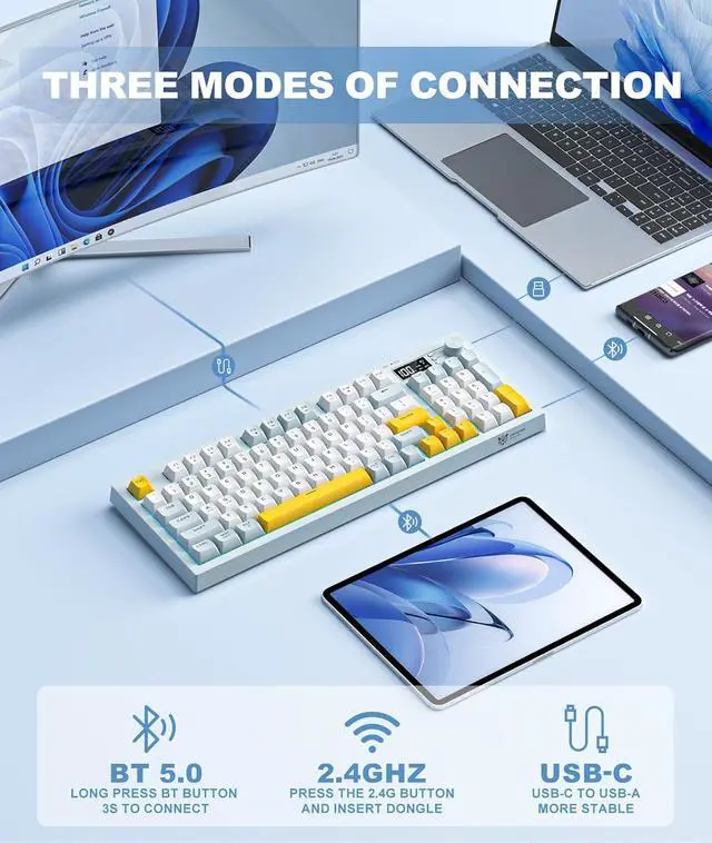 Tri-Mode Wireless KeyboardThis versatile wireless keyboard supports three connection methods: reliable Bluetooth 5.0, high-performance 2.4GH z wireless with 1000Hz polling rate, and wired USB-C mode. Enjoy seamless switching across all your devices.