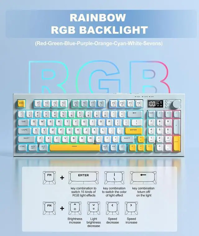 Dynamic RGB IlluminationCreate your ideal atmosphere with fully customizable rainbow backlighting. Multiple lighting modes and brightness levels let you personalize this wireless keyboard to match your setup or mood.