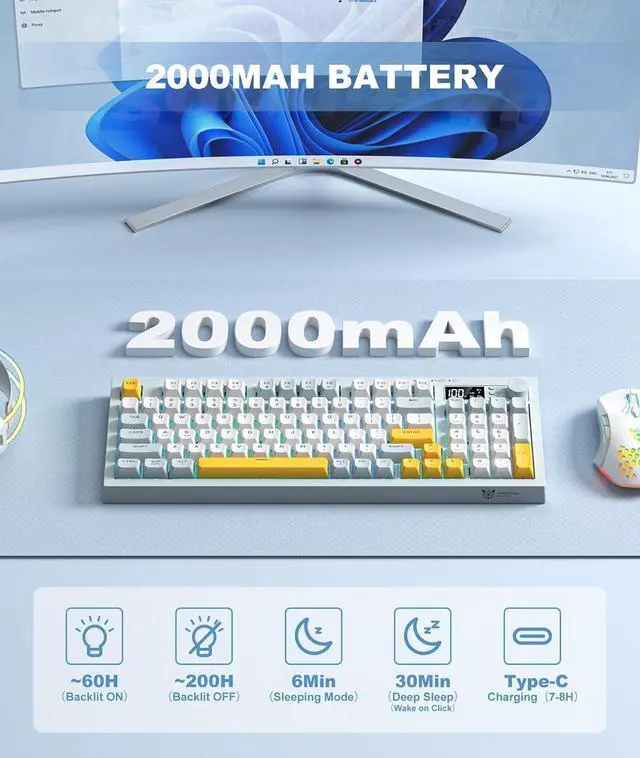 Ergonomic DesignCustomize your typing angle with built-in silicone feet and enjoy the premium texture of PBT keycaps. This wireless keyboard combines ergonomic comfort with sleek aesthetics, providing all-day typing comfort without compromising on style.