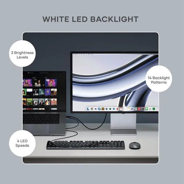 14 LED Backlit Patterns The SM3 backlit keyboard comes with a white backlight that can be increased and decreased using the F5 and F6 shortcut keys. The keyboard supports 14 different patterns with three brightness levels and four LED speeds. Users can turn the backlight and patterns on and off by holding down the lightbulb key for five seconds. This full size mechanical keyboard features a rechargeable 2500mAh battery with a future-proof USB-C port that can be used for both charging and wired mode