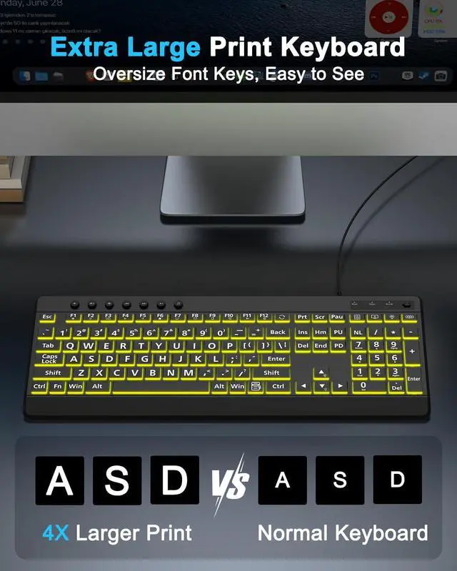 Large Print Keyboard4X larger than standard wired keyboard fonts, clear and easy to find. Alleviate your eyes, reduce typing errors, ideal for elderly, the visually impaired, students, special needs departments and libraries, etc.