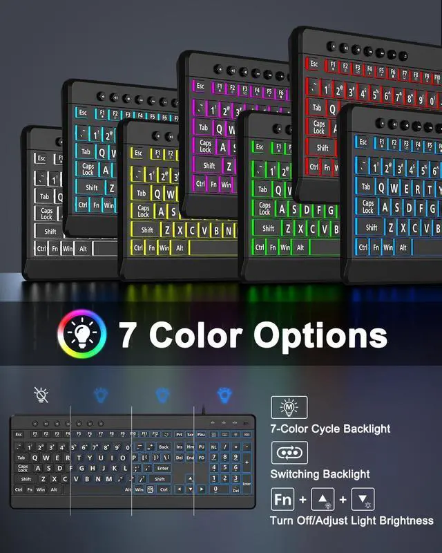 7 Backlights & 2 ModesBright and evenly distributed backlit keys has 4 levels of brightness, 7 different colors, and 2 backlight modes. Backlit can choose to turn on/off and adjust brightness, making it more convenient to type in low-light environments