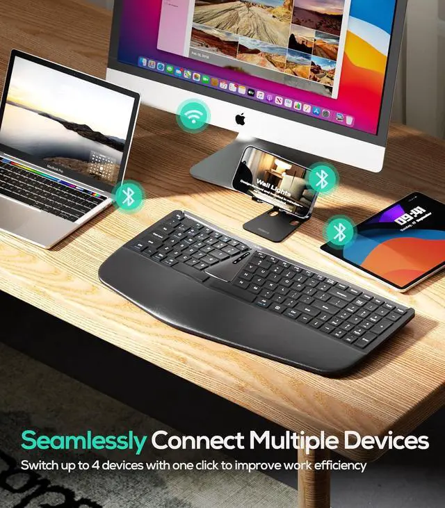Seamless Dual-Mode Connectivity: Enjoy the flexibility of smooth transitions between devices with our dual-mode (Bluetooth & 2.4G ) wireless ergonomic keyboard. Whether youre at work or play, easily switch between different devices for a streamlined experience.