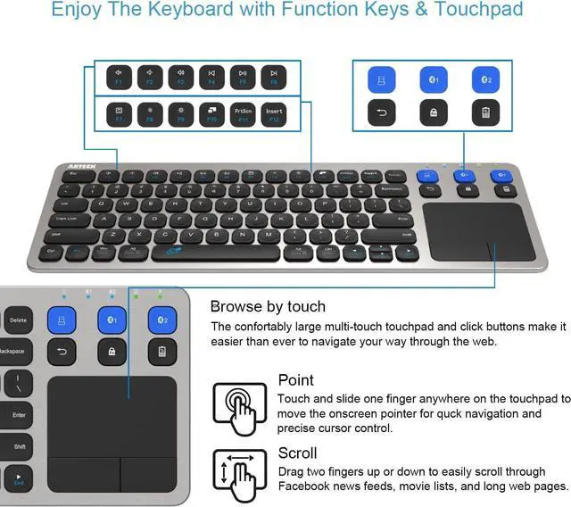A Single Clicking: This keyboard is able to connect to 3 devices ( 2.4G USB Wireless + 2 Bluetooth) at the same time. You can switch between 3 devices with a single key clicking.