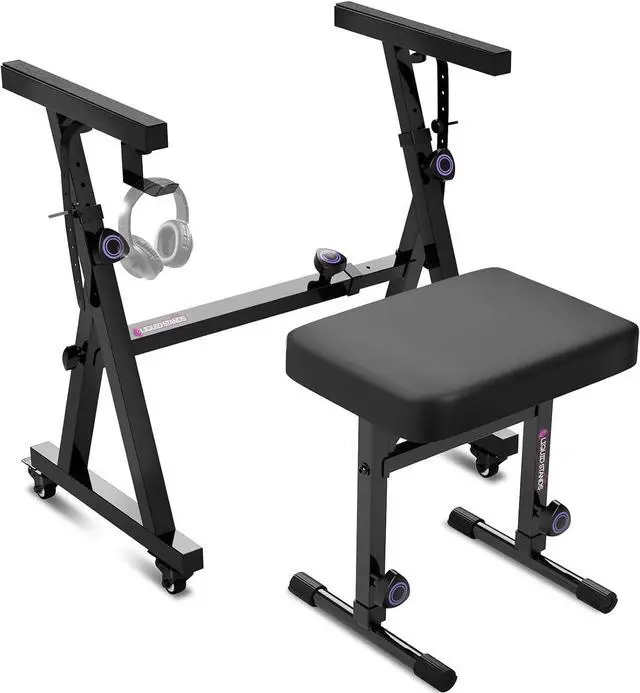 Includes headphone hook and anchoring straps: Each keyboard stand includes four locking wheels, four adjustable feet, anti-skid foam pads, and a headphone hook. Also included are two anchoring straps that attach the keyboard to the stand for extra stability and protection. Great for musicians on the road or at home.