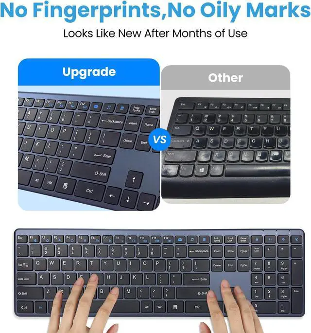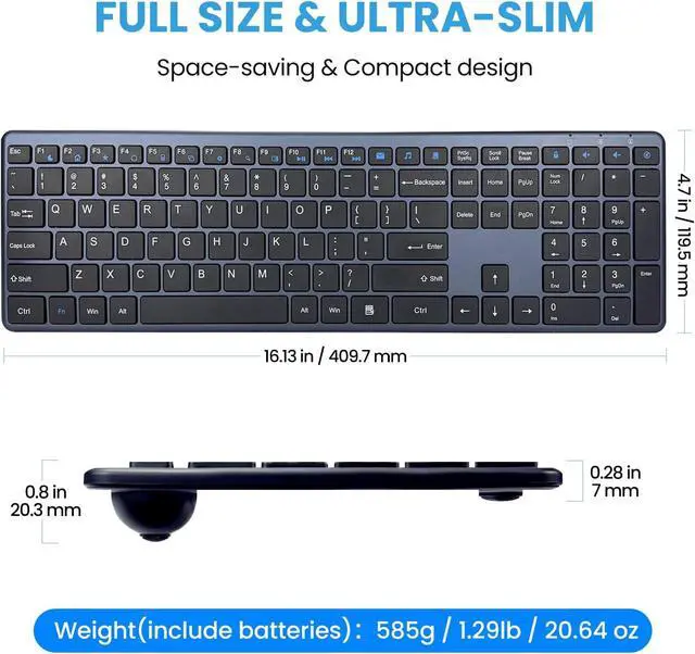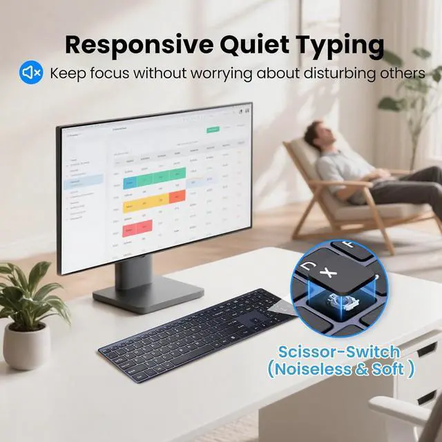 Space-Saving Full-Size & Quiet Wireless KeyboardThis ultra-slim, compact wireless keyboard designed with short-throw, laptop-style keys, offers a full standard layout with dedicated arrow keys, number pad, and customizable shortcuts, providing a comfortable and efficient typing experience in a sleek, its innovative noiseless click technology reduces noise by up to 90%, ensuring a quiet and distraction-free work environment. space-saving design perfect for both home, office, and Shared Spaces.