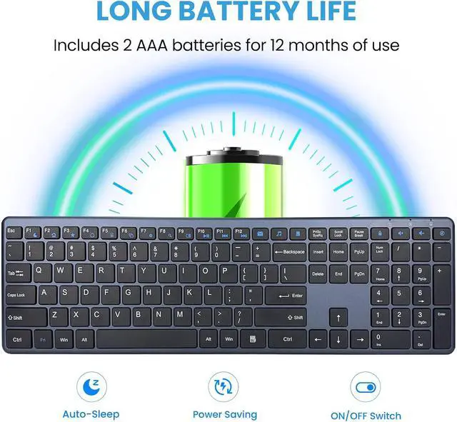 Long-Lasting Battery Life & Auto Sleep FunctionPowered by 2 AAA batteries (included), this computer wireless keyboard offers up to 12 months of usage on a single set, thanks to an energy-efficient auto sleep function that activates after 15 minutes of inactivity, reducing battery drain. An integrated ON/OFF Switch (back side) further allows you to power it down completely when not in use, maximizing battery efficiency.