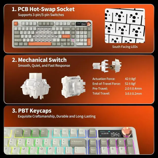 Smart TFT Display and KnobThe full-size gaming mechanical keyboard features a unique metal knob with enhanced comfort, allowing quick adjustment of complex functions: connectivity, system settings, backlight brightness/speed, RGB mode/color, volume, and language. The built-in smart TFT color display enables instant status checks, including custom GIF images (via driver), connection mode, time, lighting effects, power status, and more.
