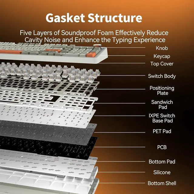 Hot-Swappable Mechanical KeyboardFeatures a gasket-mounted design with five layers of noise-reducing foam to effectively minimize airborne noise, delivering a softer typing experience. Compatible with 3-pin and 5-pin connectors, crafted for enthusiasts, gamers, and professionals!