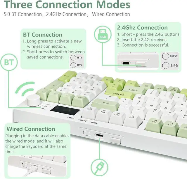 Tri-mode Connection: Equipped with three connection methods, including BT 5.0, 2.4GH z, and USB-C connection. Seamlessly switch between different devices, such as laptops, desktops, and tablets, to meet your various usage needs.