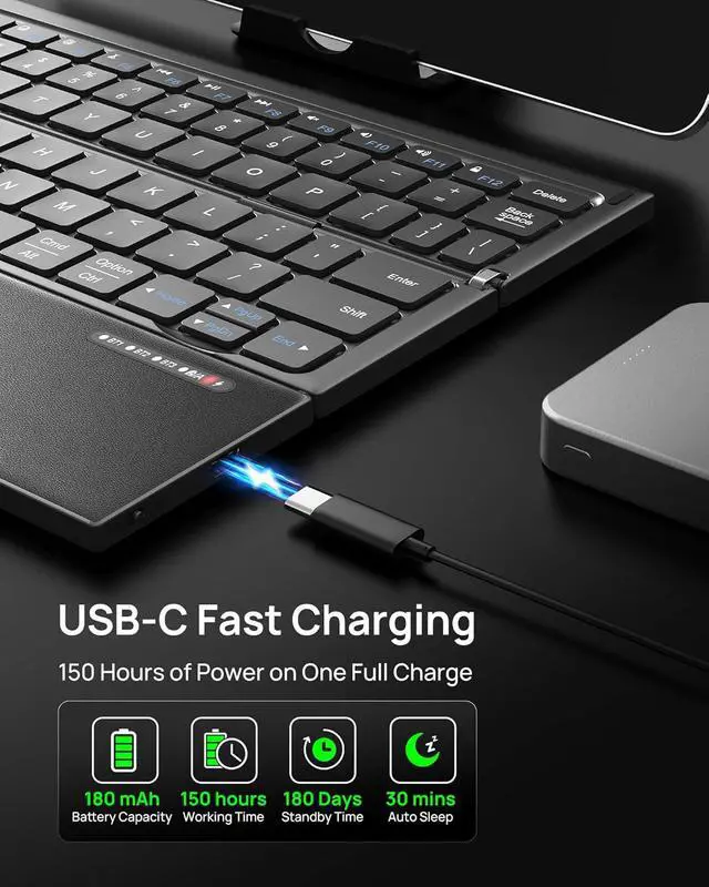 Type-C RechargeableProvides up to 150 hours of working time and up to 180 days of standby on a full charge. This foldable keyboard with touchpad automatically enters sleep mode after 30 minutes of inactivity to conserve power, and wakes instantly with a single key press. Stay focused on your work without worrying about recharging.
