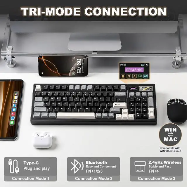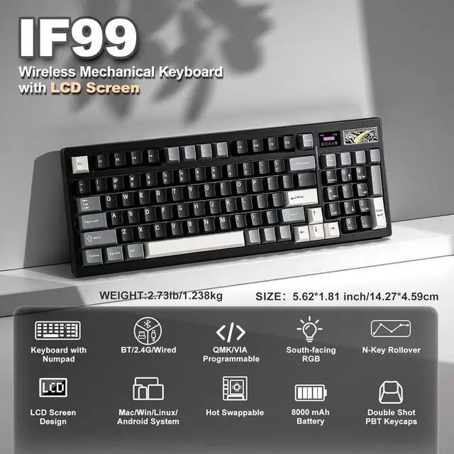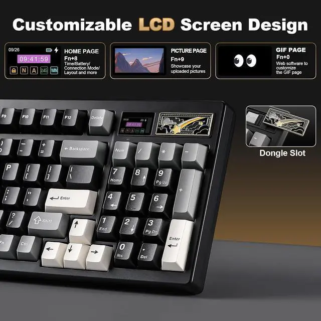 Personalized Display: YUNZII IF99 wireless mechanical keyboards features a customizable LCD screen that can display time, GIFs, photos, battery status, connection mode, and more. Personalize it with your favorite images, like pets or loved ones, to keep you motivated during work or gaming. Enjoy an added touch of personalization that sets your computer keyboard with screen apart