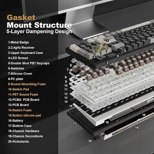 Gasket Mount Hot Swappable Gaming Keyboard: This creamy keyboard with number pad features a gasket-mounted design with multiple layers of sound-absorbing material, reducing noise and enhancing typing comfort. The full-key hot-swappable thocky keyboard allows you to easily swap out 3-pin or 5-pin switches to customize the tactile keyboard feel and creamy keyboard sound of every keystroke